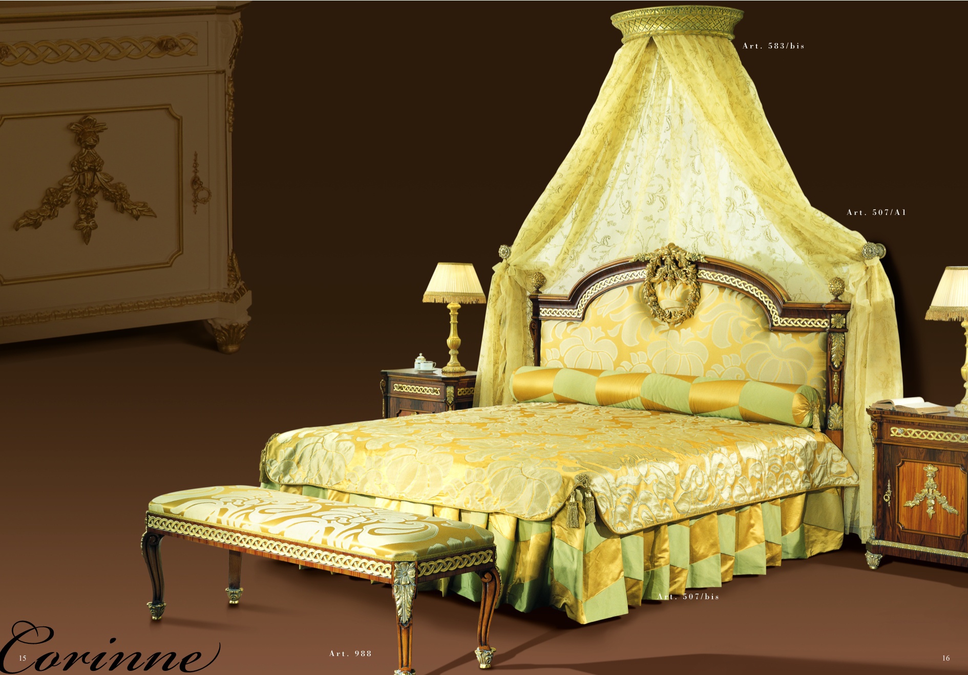 Bed c double canopy bed from Italian manufacturer Mida. Carved in the antique style, covered with gold leaf. Upholstered high headboard upholstered in silk. Golden canopy will create a cosy atmosphere. The set includes a stool. Color gamma is in light green and Golden tones.