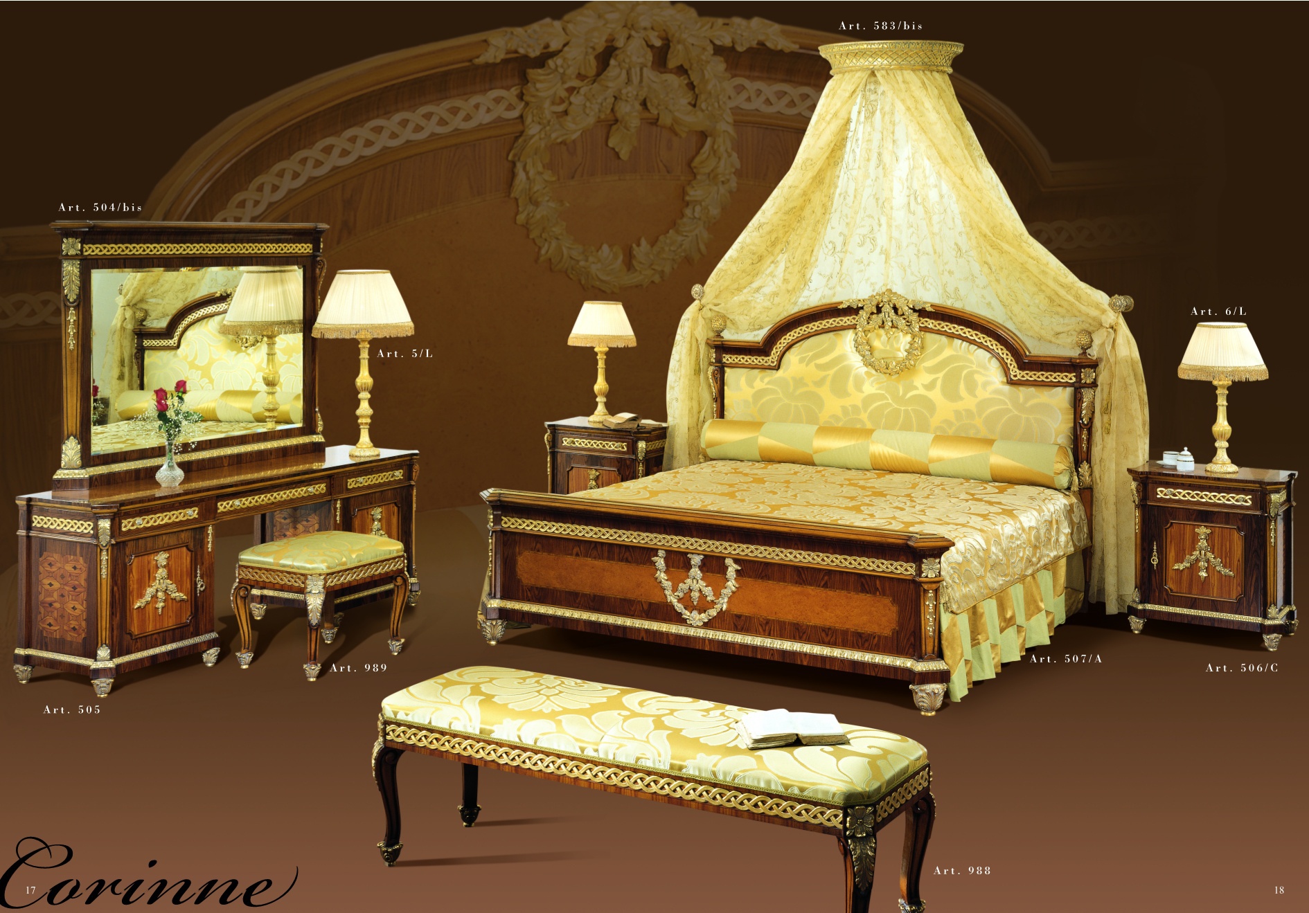 Headsets for bedrooms from Italian manufacturer Mida. Double bed with high, padded headboard. Upholstery, silk with a gold pattern. A canopy of Golden color will give comfort.Complete dressing table, Ottoman, stool, bedside tables. The whole set is made of wood and decorated with antique carvings painted in Golden color.