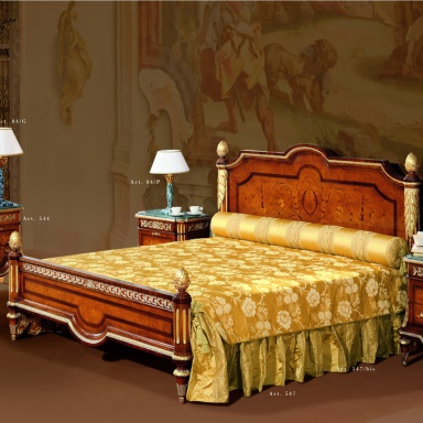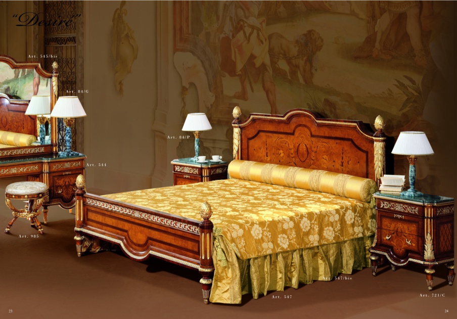 Headsets for bedrooms from Italian manufacturer Mida. A beautiful combination of warm colors of wood with gold upholstery. Carved ornaments decorate the furniture.Carved legs give lightness. Lamp on marble pedestal, decorated with gold, perfectly complement the set.