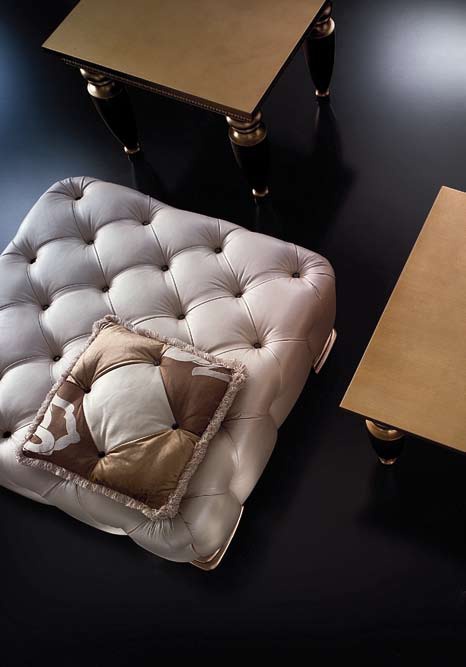 Living room set from the Italian manufacturer Paolo Lucchetta. This set includes a sofa, two coffee table and a pouf. Set in gold color. The headset corner sofa with soft quilted lining.