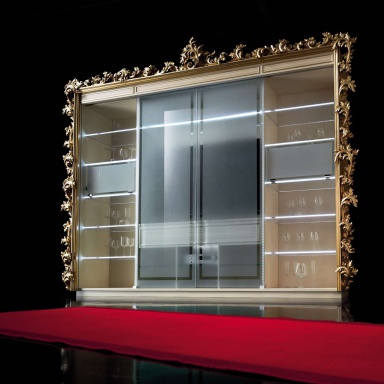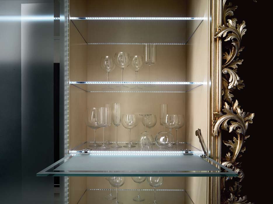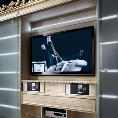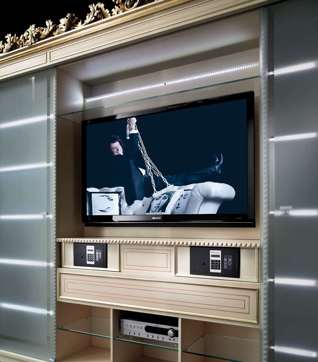 System for TV by Italian producer Paolo Lucchetta. This model at first glance seems to be a showcase for store crystal. For Matt steklami doors provided a place to install the television screen. Bromley the system Golden decor.