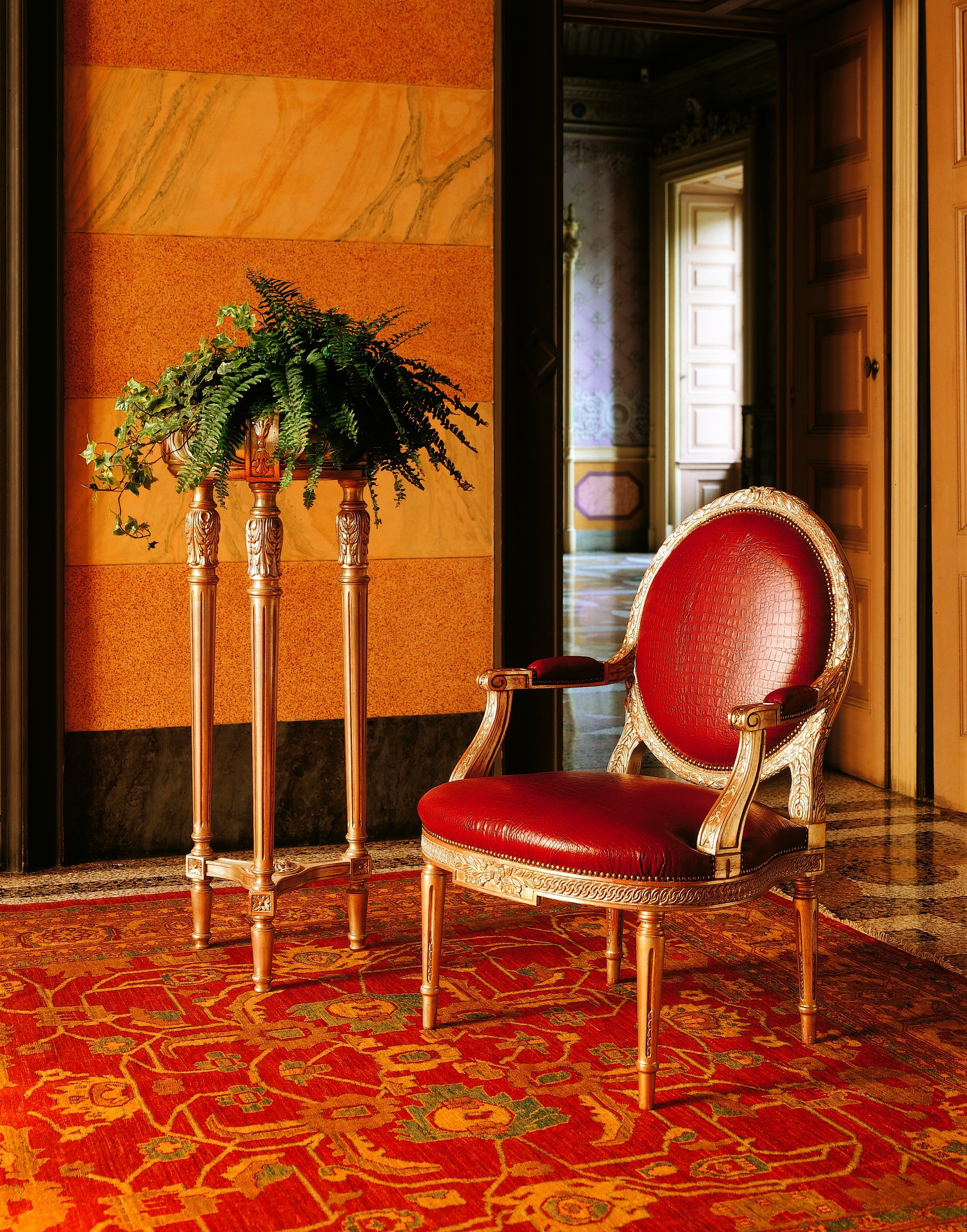 A chair from the Italian manufacturer Fratelli Sanvito. The frame is made from solid wood, filler - foam, upholstery - leather. The frame is inlaid in gold plated finish. Gorgeous model with armrests is designed for hall or hallway in a classic style. Product color red.