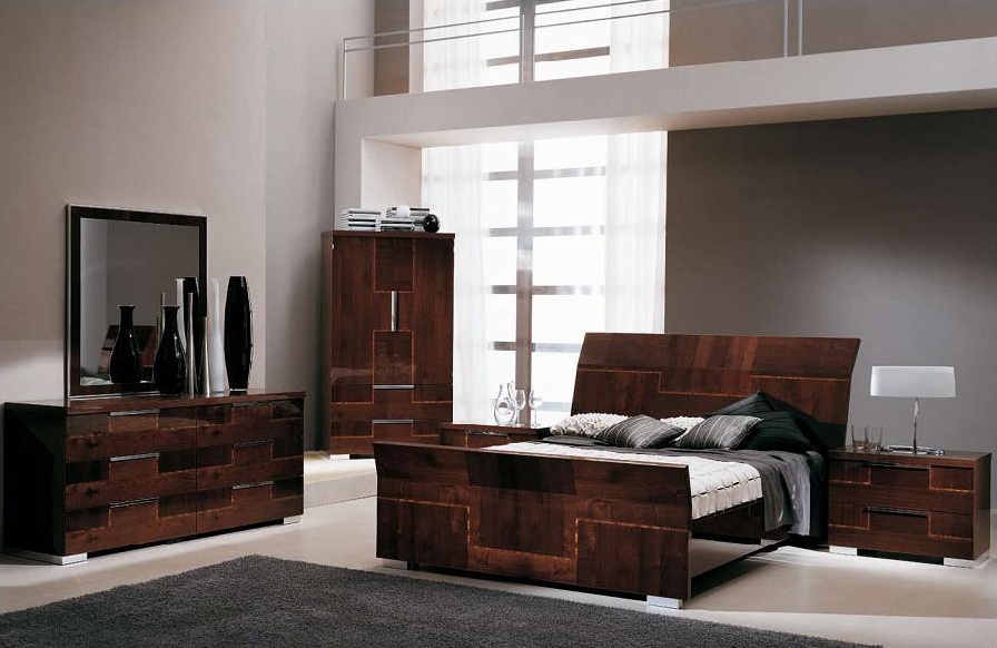 Set includes: double bed with high headboard and footboard, bedside Cabinet, chest of drawers and wardrobe. The frames are made of wood. Finishing varnish from the company portfolio. Set is decorated with wooden inlays with various finishes. The model is made in modern style.