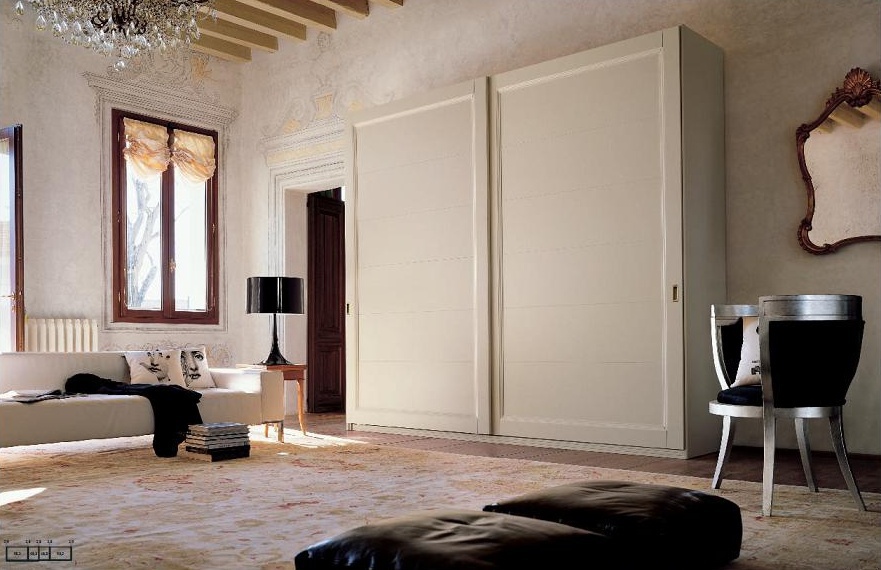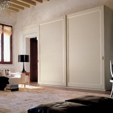 Wardrobe, from the Italian manufacturer Alf. The frame is made of wood. Doors rashaayda. The model is designed for modern bedrooms. Color range: white.Finish - Matt lacquer from the company portfolio. The model consists of two broad sections with sliding doors.