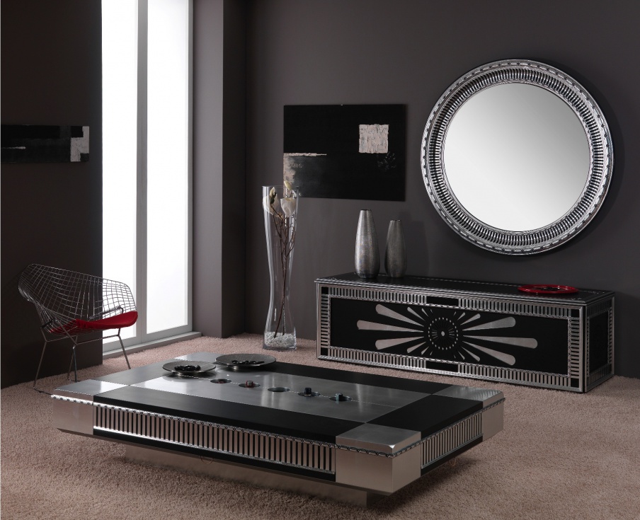 Living room set from the Italian manufacturer Vismara. This headset is equipped with a table in the middle of the bar. The furniture is made from wood with decorative elements of metal. And presents a model of a round mirror in a frame. The perfect solution for the living room designed in the art Deco style.