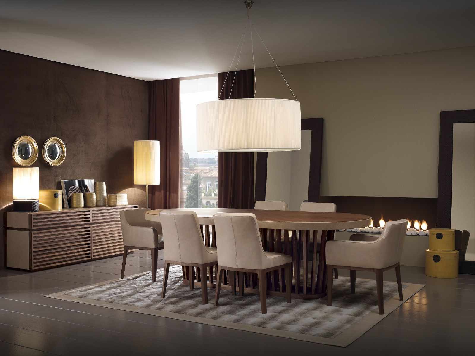 Set for the dining room from the collection of the Absolute from the Italian manufacturer Ulivi. Consists of oval dining table and upholstered chairs. Frame, top, legs - natural wood. Upholstery of chairs is made of leather. Coating wooden surfaces is Matt varnish. Set is made in modern style.