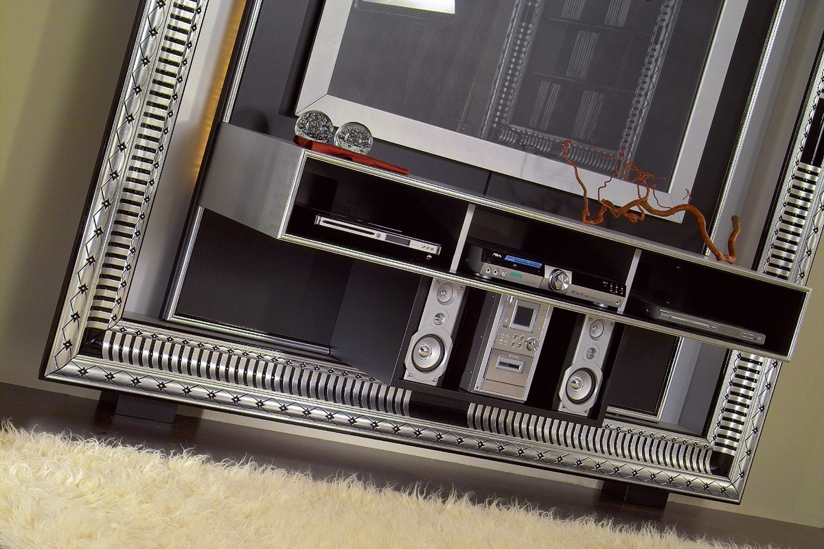 The panel under the TV and The Home Cinema Frame from the Italian manufacturer Vismara. The system is equipped with shelves for storage drives, speakers. There is a place for screen installation, integrity creates the impression of wall paintings.