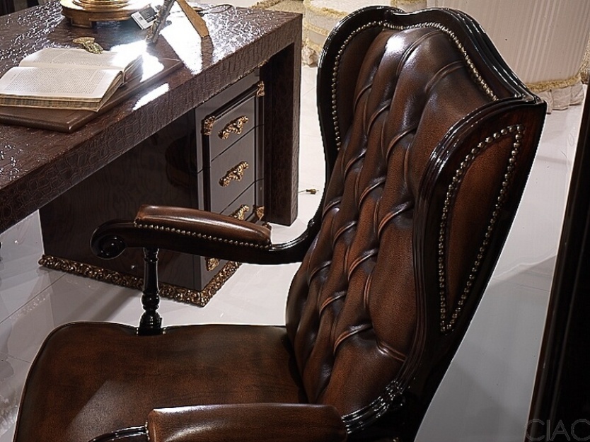 Headsets for the office from the Italian manufacturer AR Arredamenti. The frame is made from solid wood. The table rests on carved feet. Armchair with leather upholstery. Furniture with hand carvings will decorate the living room or Cabinet in art Deco style.