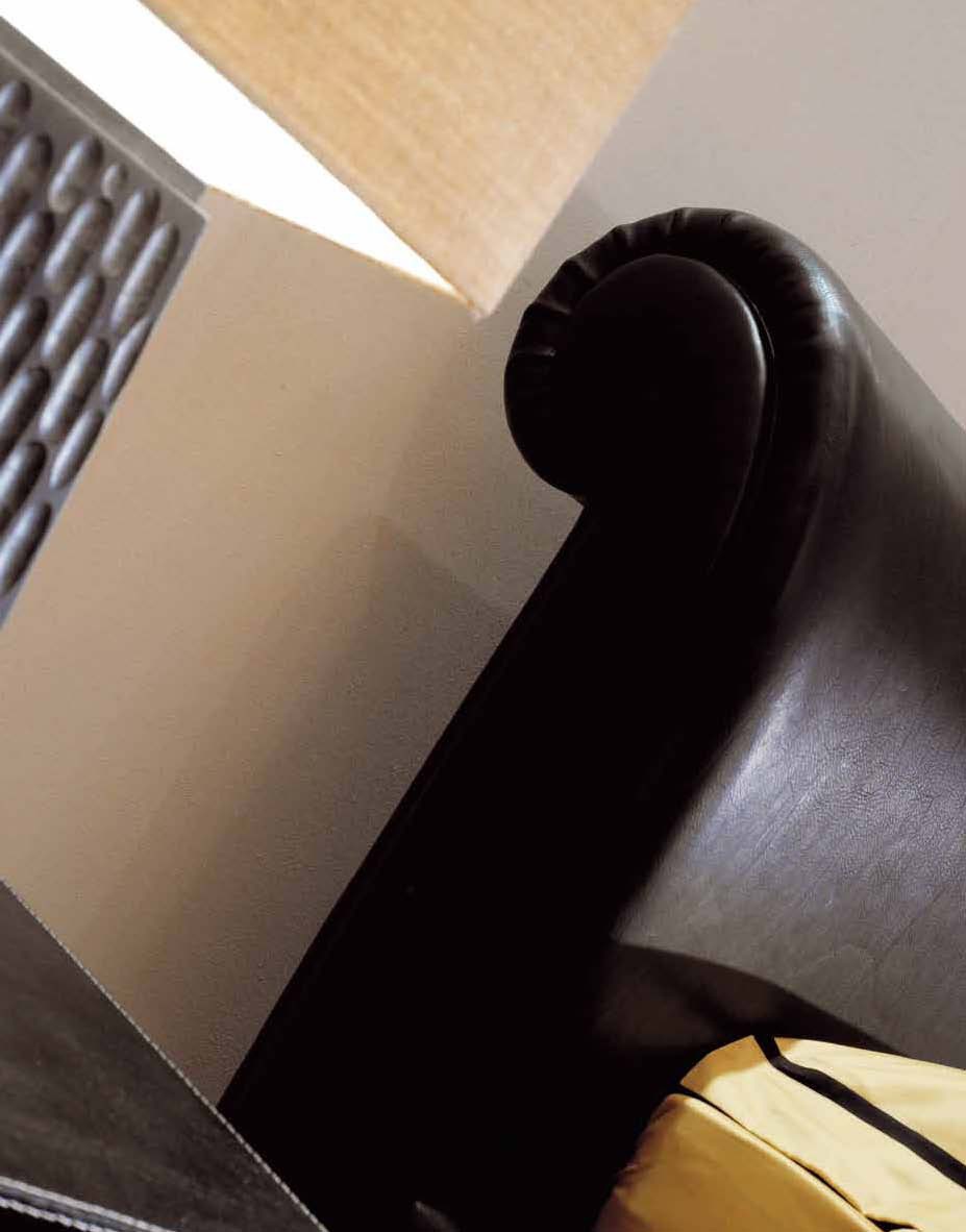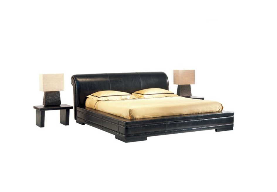 Kamal double bed from Italian manufacturer Ulivi. Model on low legs square shape. Material frame of beech. Headboard with a rounded shape. The upholstery is made of black leather. The model is made in modern style.