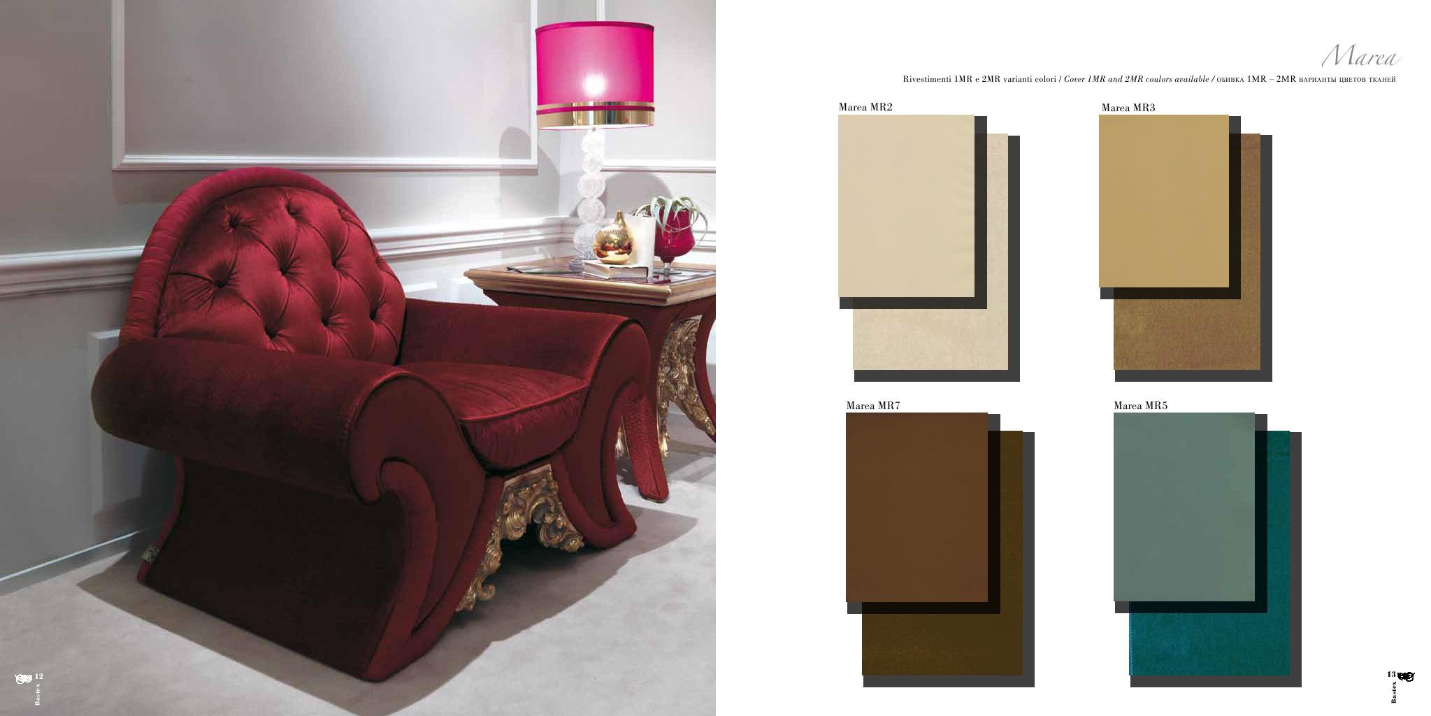 Chair Marea, from the Italian manufacturer Bastex. The frame is made of wood. Upholstery - textiles from the company portfolio. The model is decorated with stitch Capito and carved elements Golden color. The armrests are gently wrapped. The model will perfectly complement a modern interior.