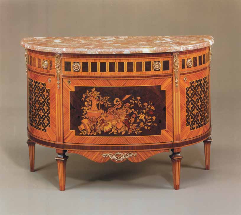 A chest of drawers from Italian manufacturer Binda Mobili. The frame and legs made from solid wood. Finish - gloss lacquer. Table top semi-circular shape made of marble. The model is decorated with carving covered with gold leaf. The facade is decorated with paintings. The model is made in classic style.