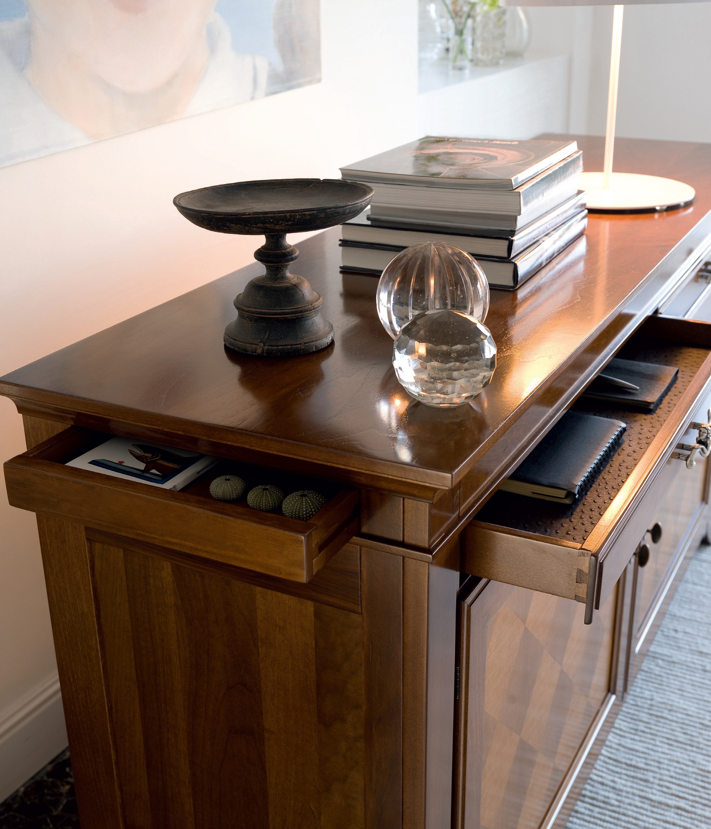 Chest of drawers from Italian manufacturer Bruno Piombini. The chest is made from high quality wood. The model with four drawers and two shkafchik. Two boxes out of the sides of the countertop.