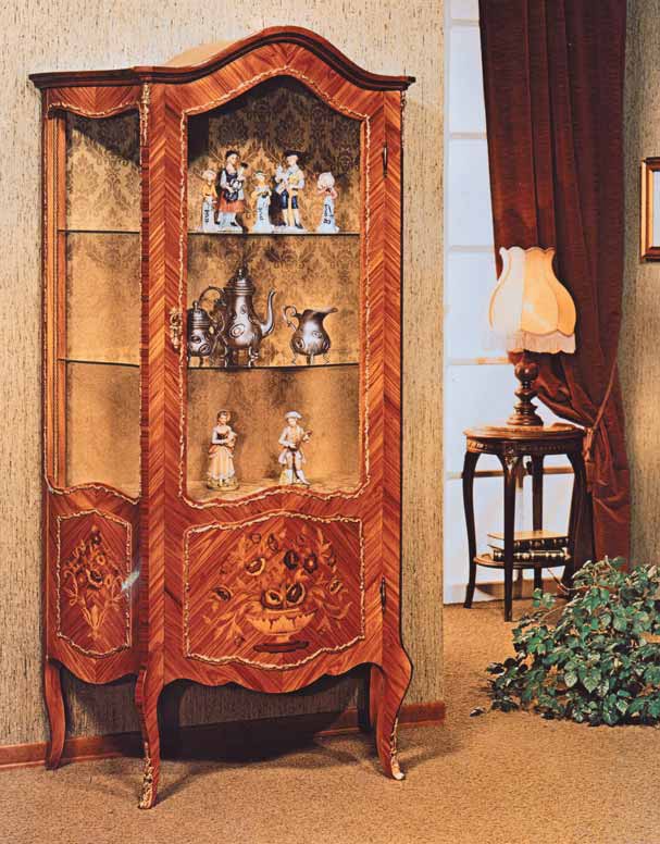 Showcase from Italian manufacturer Binda Mobili. The model is made in classic style. Material - solid wood varnished. Feet high curved shape. Exterior and sides glazed. The facade was decorated by handmade paintings. Internal filling - glass shelves. The hinged door has a lock. The model is made in classic style.