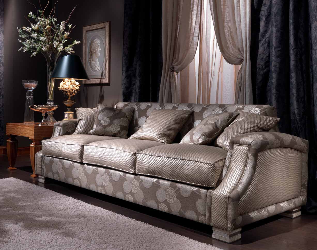 Sofa set in art Deco style by Italian manufacturer Busnelli Adamo. Exclusive furniture will add a touch of solemnity and uniqueness. Set includes double sofa, armchairs and a coffee table made from natural wood, decorated with carved elements in the decoration of a gold.
