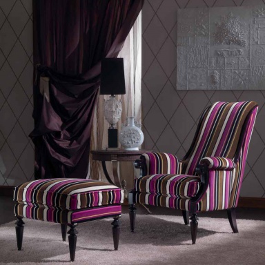 The chair and Ottoman from the Italian manufacturer Busnelli Adamo. Exclusive furniture will add a touch of solemnity and uniqueness. Frame made of natural wood, decorated with carved elements. Upholstery - textiles from the company portfolio.
