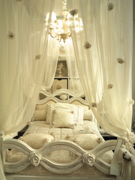 Double bed from Italian manufacturer Bitossi. The model is made in classic style. The frame is made from solid wood. Headboard and footboard curly shape. The model is decorated with decorative roses covered with gold leaf. The trim is made of textile and light color is also decorated with roses and gold fabric.
