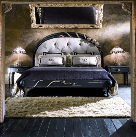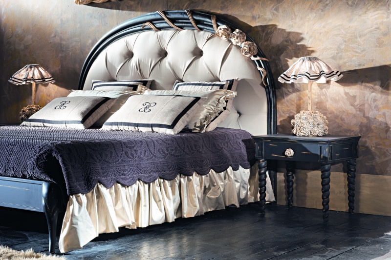 Double bed from Italian manufacturer Bitossi. The model with semi-circular headboard. The frame is made from solid wood. Upholstery textile. Colors to choose from a range of companies. Headboard adorned with decorative stitch-Capito and metal rosettes painted in Golden color.