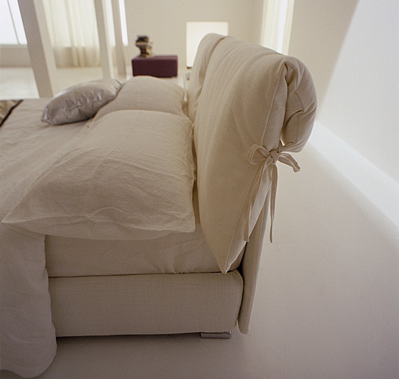 Ibiza double bed by Italian manufacturer Bolzan. Model on four metal legs. The frame is made from solid wood. Complement the soft headboard cushions in fabric. Finish to be selected from the range of the company. The bed is designed in modern style.