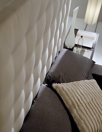 Zen double bed by Italian manufacturer Bolzan. Model on high wooden legs. The finish is lacquer black. High headboard covered with white textiles. The ornament serves as a decorative stitch-Capito. The model is made in a modern style.