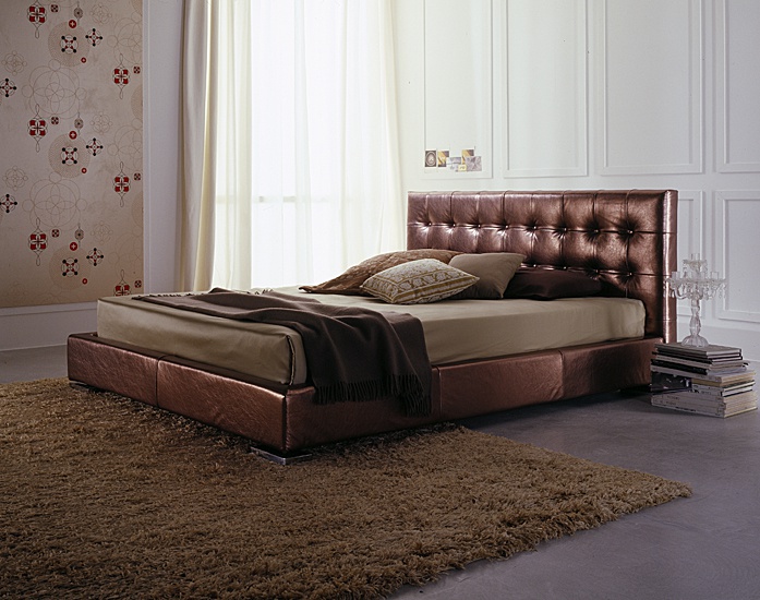 Vogue double bed by Italian manufacturer Bolzan. Model with metal legs. The frame is made from solid wood. Low headboard with decorative stitch-Capito. Textile upholstery is offered from the company portfolio. The bed is designed in modern style.