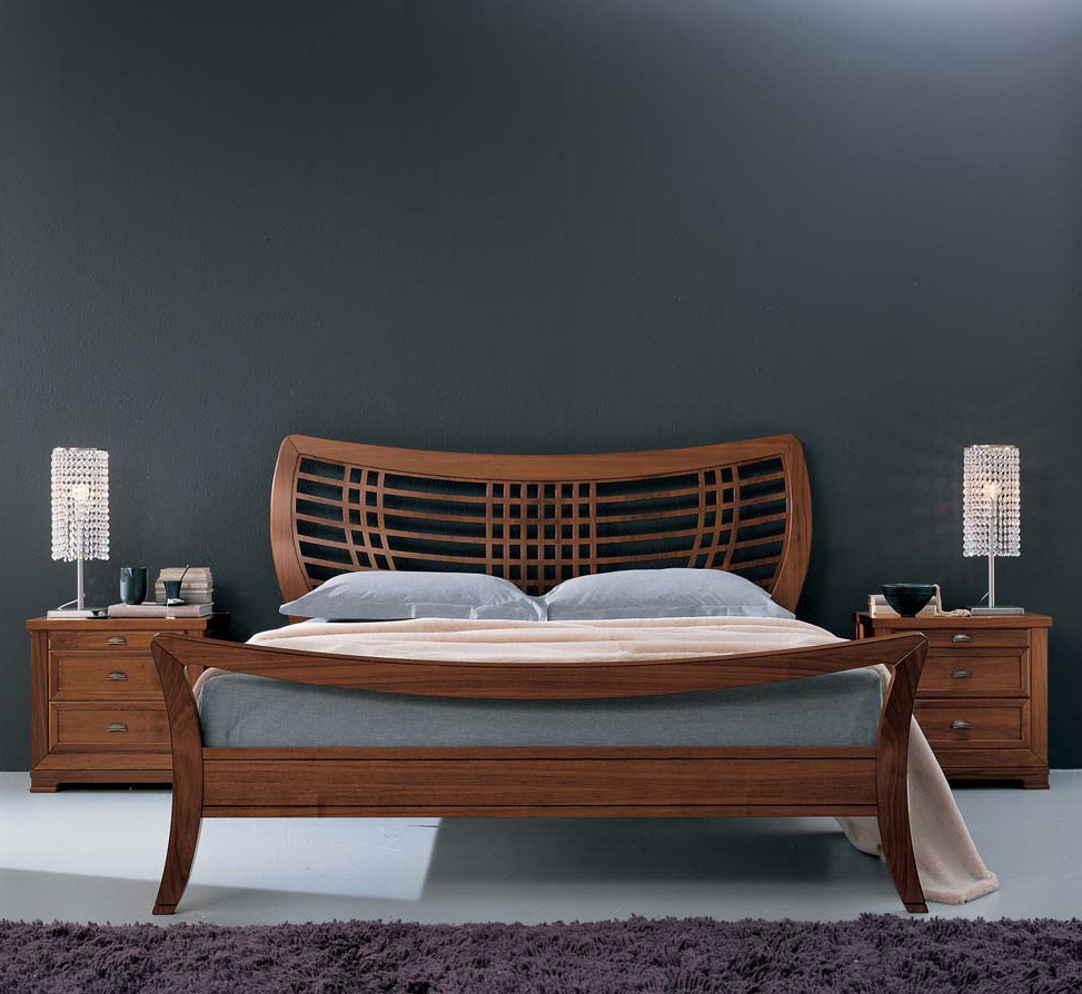 Double bed Italian manufacturer Bruno Piombini with shaped high headboard and low footboard. Headboard solid wooden pattern, which is a kind of interweaving strips.