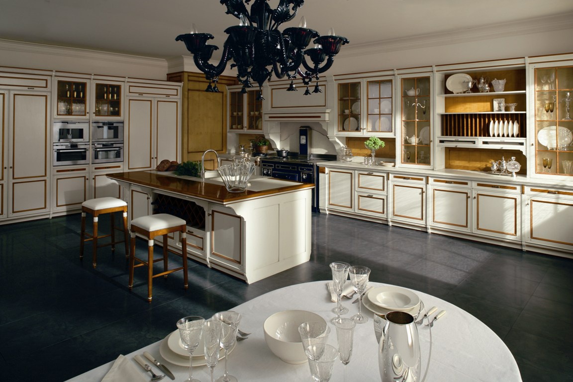 Kitchen from Italian manufacturer CA'd'oro. The model with the island. The frame is made of solid wood, covered with lacquer or wax. Color option - white. Accessories metal. Working surface made of stone. The model is equipped with two integrated sinks and lighting. Set is made in a classic style.
