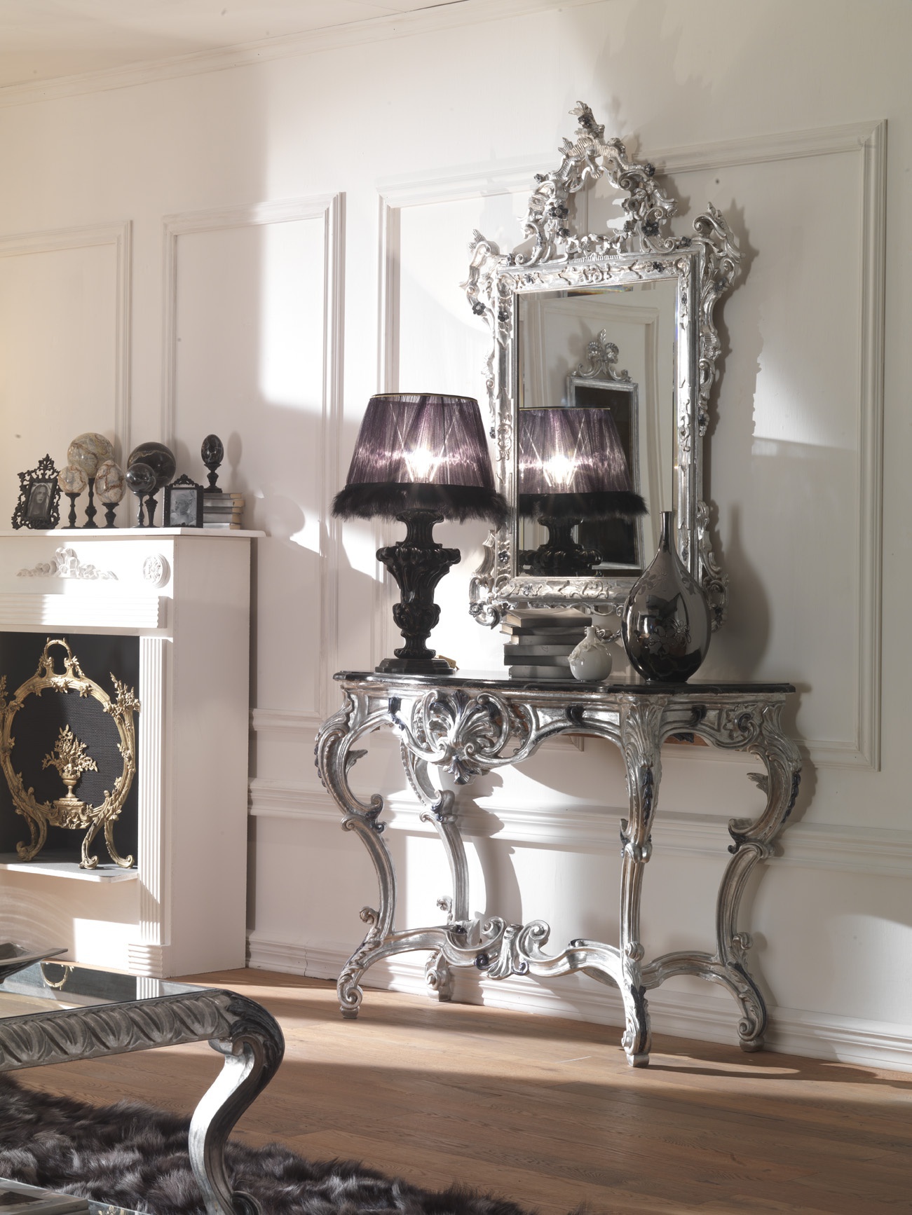 Sofa set from the Italian manufacturer Cafissi. The furniture is made in Baroque and Rococo styles, blends into exquisite classical interior. Set includes: triple sofa, chair, console and coffee table with glass top. The frame is natural wood, the design complements the hand-carved. Finishing - varnish, silver foil. Upholstery - textiles from the company portfolio.