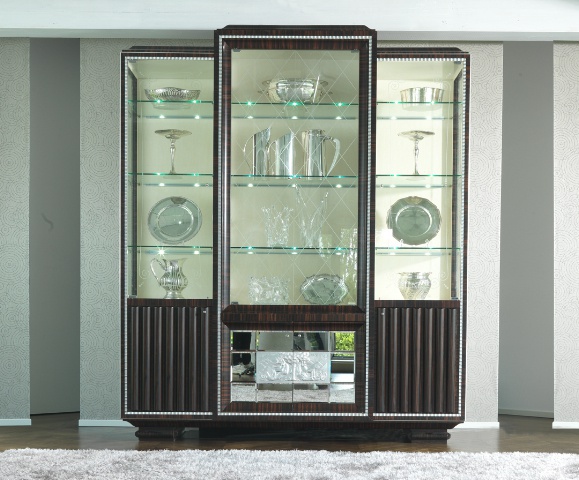 Showcase Deco from Italian manufacturer Cantaluppi. The body is made of solid wood, shelves, top doors and sides glass. Design complete the bottom center of the door mirrored the stele. Chic model is designed for the living room or dining room in art Deco style. Product color natural wood.