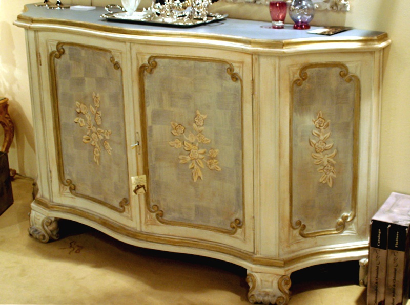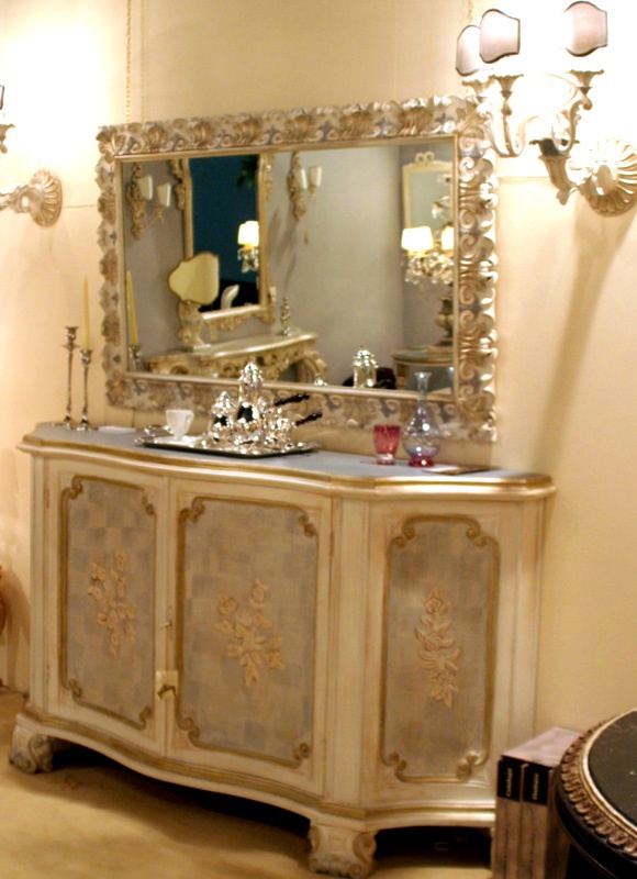 A chest of drawers from Italian manufacturer Calamandrei & Chianini. Model low on figured legs. The frame is made from solid wood. The table top of natural stone. Accessories metal. Hinged door is lockable with a key. The finish offers white elements painted in Golden color. Decor - hand carved. The model is made in classic style.