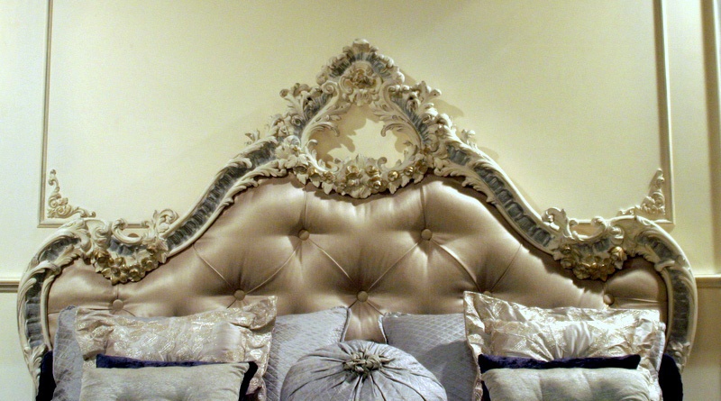 Double bed from Italian manufacturer Calamandrei & Chianini. Model with a hidden frame. Headboard high shaped form. Upholstery textile from the company portfolio. Decoration is hand carved sculptures and decorative stitch-Capito. The bed is made in classic style.