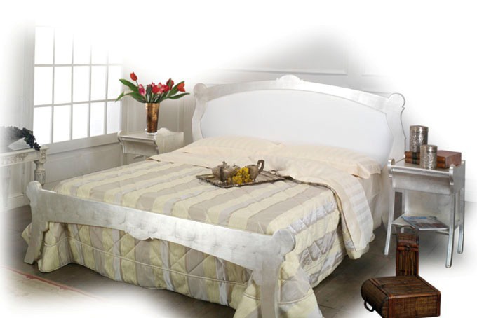 Double bed from Italian manufacturer Calamandrei & Chianini. The model with headboard and footboard. The frame is made of wood painted white. The textile upholstery is available in white.