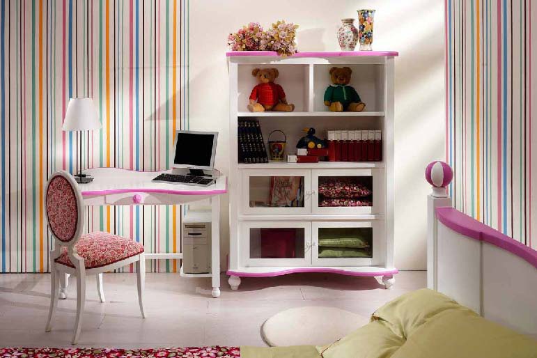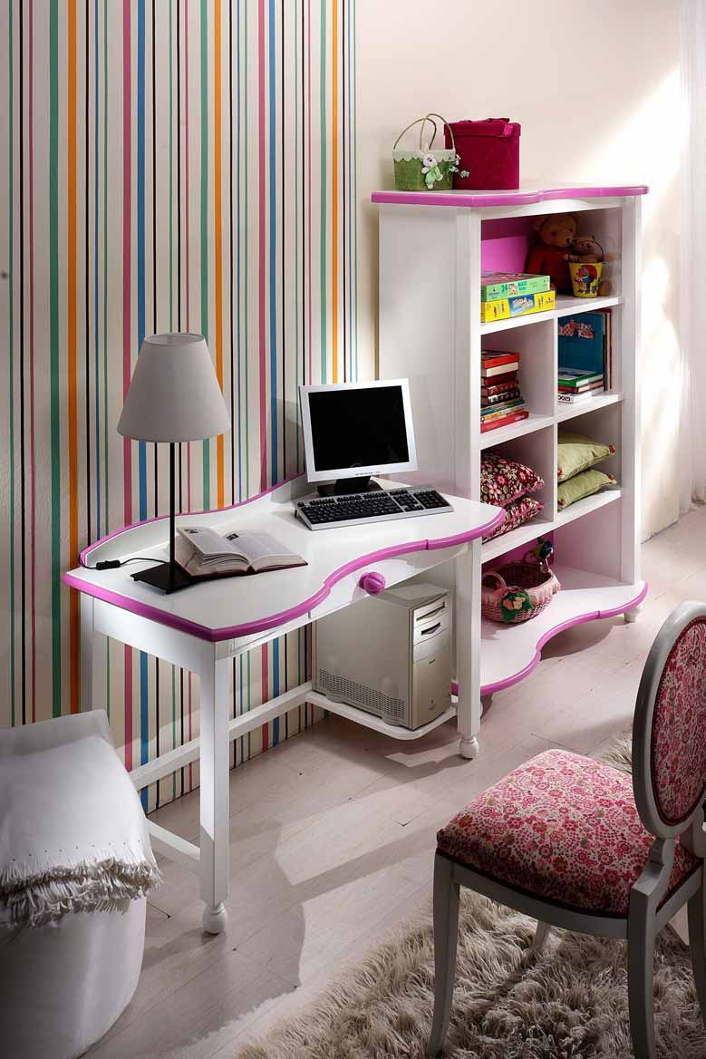 Set for kids room from Italian manufacturer Casa Nobile. Consists of single beds, bedside tables, chest of drawers, Desk and chair. Material - solid wood. Colors available in combination of white and pink. Decoration are ornamental knobs of the original form.