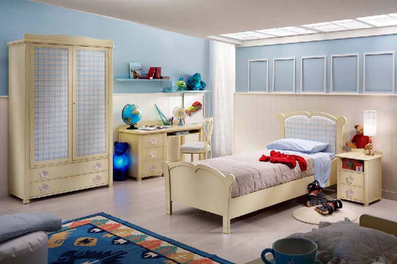 Set for kids room from Italian manufacturer Casa Nobile. Consists of single bed, Desk, wardrobe, chair and bedside tables. All items made from solid wood. Finish offered a choice from a range of companies. Upholstery textile light color. Set is made in Scandinavian style.