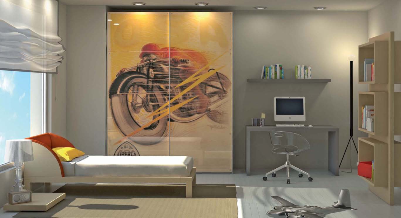 Set for kids room from Italian manufacturer CIA International. The model consists of a single bed, wardrobe, bedside tables, Desk, chairs on casters and a shelving system. Material - solid wood and metal. Upholstery textile from the company portfolio. The originality of the model gives the closet with a huge picture on the front. Set is made in modern style.
