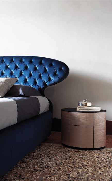 Double bed from Italian manufacturer Ciacci. The model is made in the art Deco style. The case is completely covered with textile. The finish offers light and dark colors. Feature is the oval headboard. The ornament serves as a decorative stitch-Capito. The bed is practical and durable.