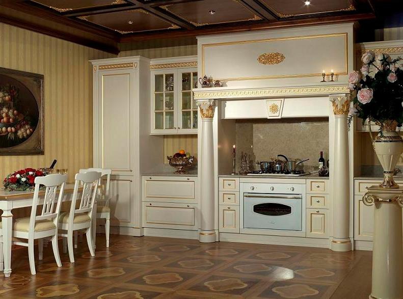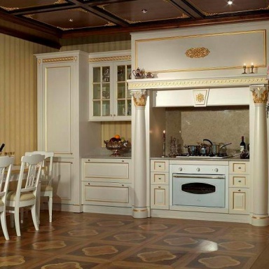 Kitchen from Italian producer, Castello. The model is made in classic style. The frame is made of solid wood painted white. Fittings made of metal. Fold two kinds of deaf and glass. The model is decorated with hand-carved gilded.