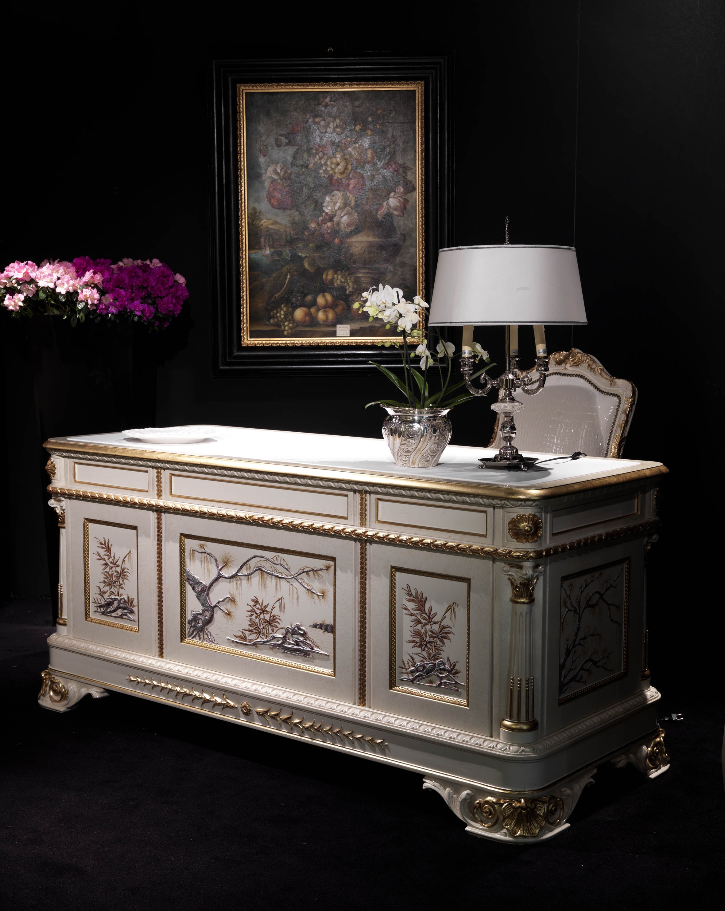 Desk Michelangelo from Italian manufacturer Cantaluppi. The model is made from natural wood. A table decorated with gilded decorative elements. The product with drawers is designed for the office in classic style. They are decorated with decorative figures. Available color is white.