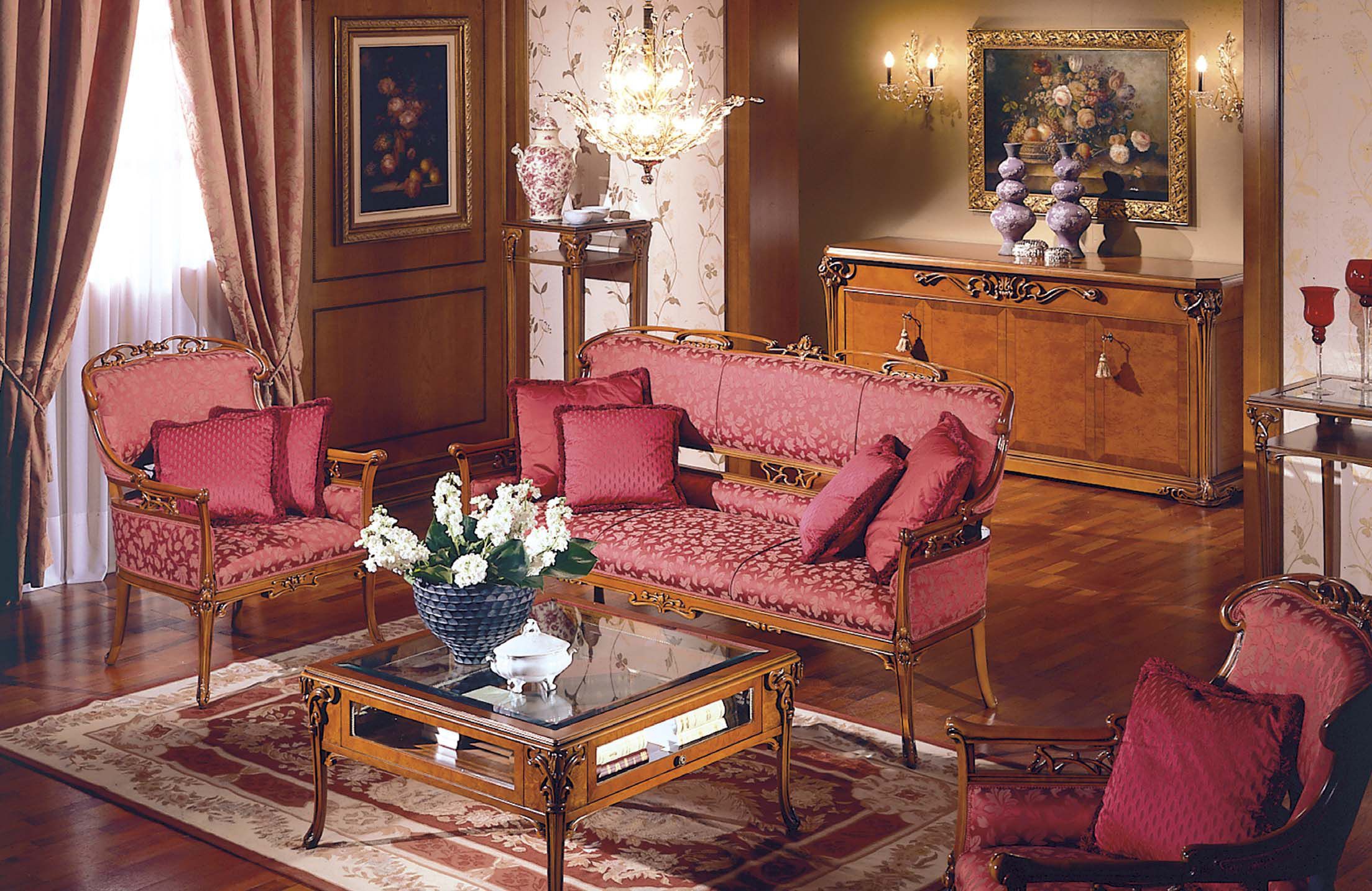 Sofa set Rosa Liberty from the Italian manufacturer C. L. Italia. Set in a classic style, consists of - triple sofa, armchairs. The furniture is made of solid wood, upholstery - textiles from a range of campaigns. The design of complementary decorative pillows. Color products Burgundy.