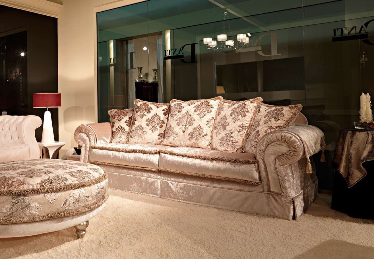 Sofa from Italian manufacturer Danti. The frame is made from solid wood, the seat filler - foam, upholstery - textiles from a range of campaigns. The base is hidden a decorative "skirt". The seats are removable. The design of complementary decorative pillows of different sizes. The model is designed for the living room in classic style. Product color ivory.