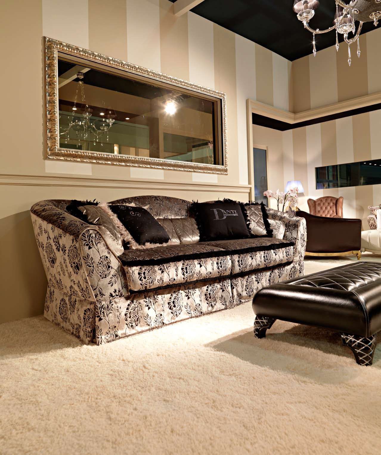 Sofa from Italian manufacturer Danti. The frame is made from solid wood, filler - foam, upholstery - textiles from a range of campaigns. The seats are removable. The base is hidden a decorative "skirt". Double model for living room in classic style. The design of complementary decorative pillows different shapes. Colours in stock.