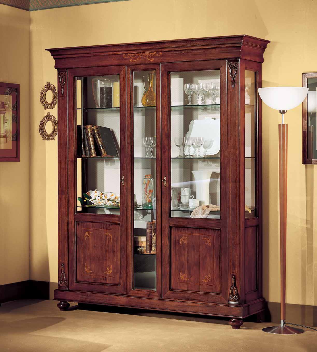 Showcase from the Italian manufacturer the Corso. A model of a low lying circular shape. The frame is made from solid wood. The sash and the sides glazed. Internal filling - glass shelves. The lower part of the blind. Decorative accessories made of metal. Hinged door is lockable with a key. The decoration is hand carved.