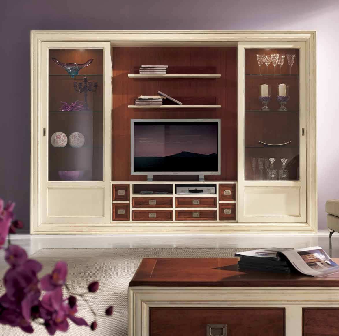 The Italian Cabinet from the manufacturer the Corso. The model is made in classic style. Consists of open shelves, drawers and closed sections. The frame is made from solid wood. Sash glass. Decorative accessories made of metal. Finish offered a choice from a range of companies. There is a place for TV.
