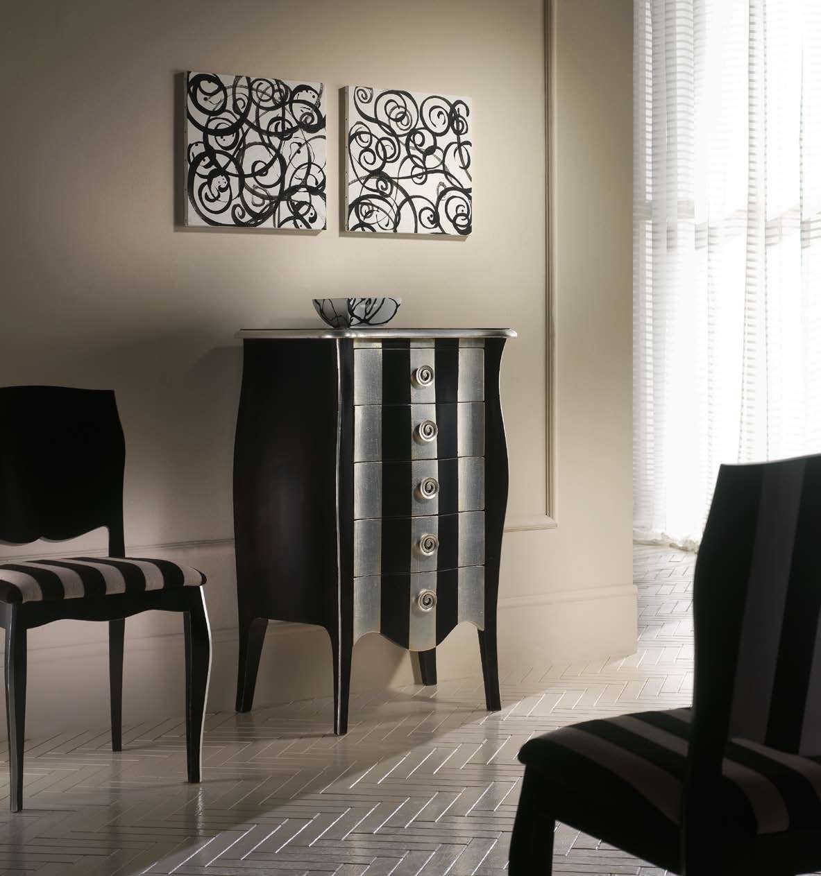 A chest of drawers from Italian manufacturer Domus Mobili. The body is made of solid wood. Decorative accessories - metal. A model with five drawers. A lovely choice for a hall or hallway in a contemporary style. Colours in stock.