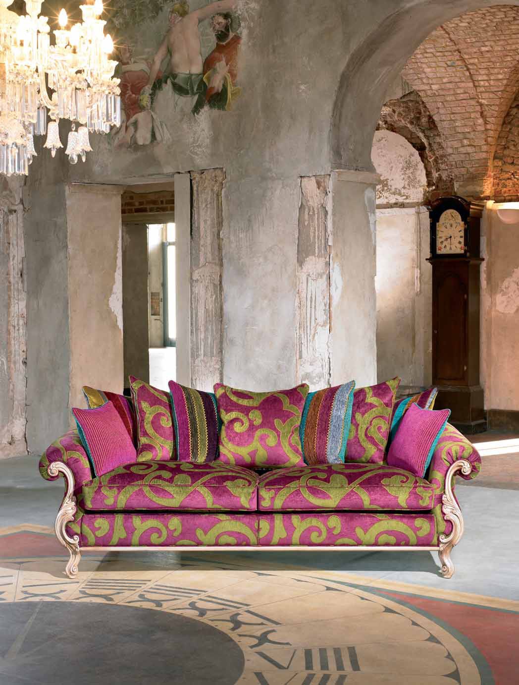 Three seater sofa from Duresta British company. The company uses only natural materials. Frame made of hardwood. The design is complemented by hand carved. Filler - fluff. Upholstery fabric with exclusive author's pattern. The model will perfectly complement a classical interior, in the house will create a unique atmosphere of luxury and comfort.