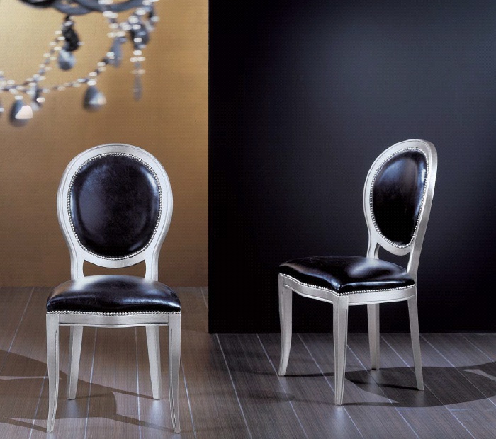 The Ophelia chair from the Italian manufacturer Formerin. The frame is made from solid wood in the finishes grey lacquer, upholstery - leather. Model with round backrest dining room will decorate in the art Deco style. Product color black.