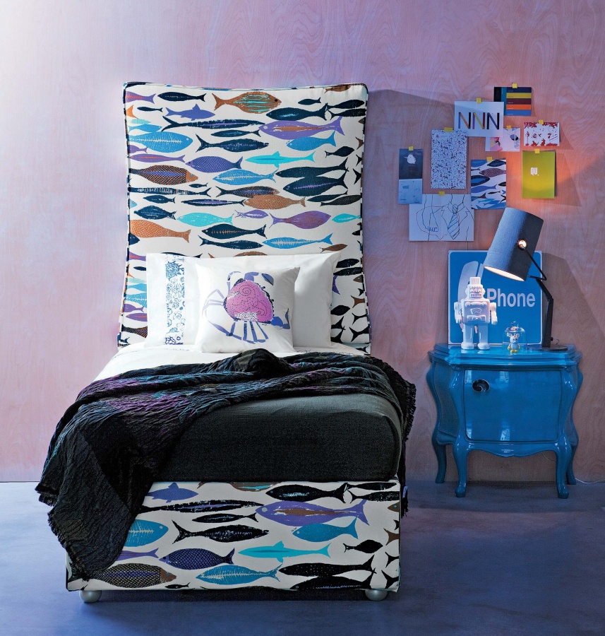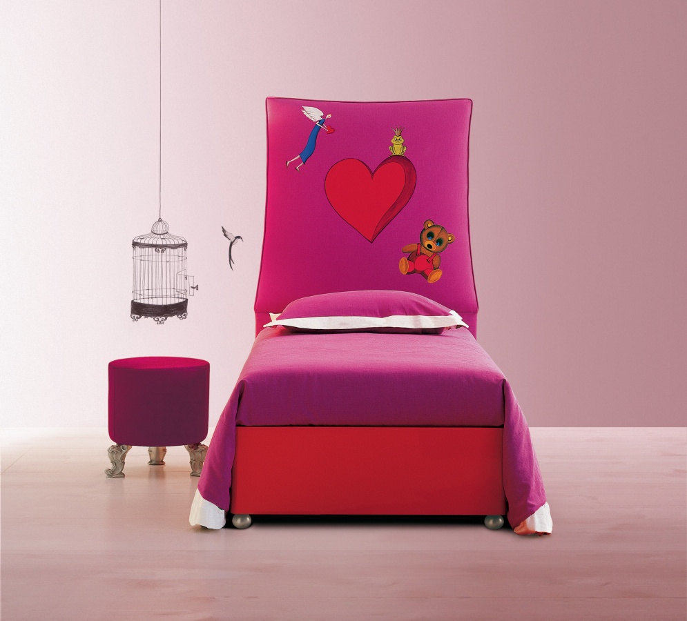 Biscottino single bed from Italian manufacturer Creazioni. Model on low legs with a semicircular shape. The frame is made from solid wood painted in red. The model feature a high headboard. Textile upholstery is offered from the company portfolio. The model is designed for a child's room . Made in a modern style.