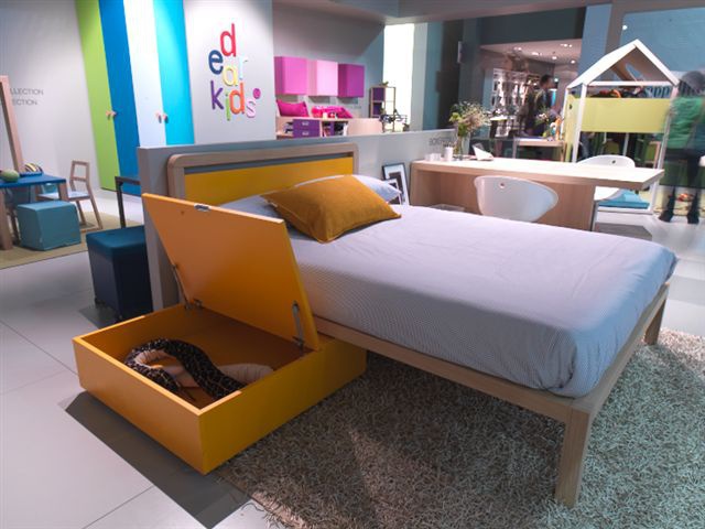 Single bed from Italian manufacturer Dear Kids. The model is made entirely of solid wood. Finish natural wood color. Upholstery textile from the company portfolio. The augmented model with storage box. The model is made in a modern style.