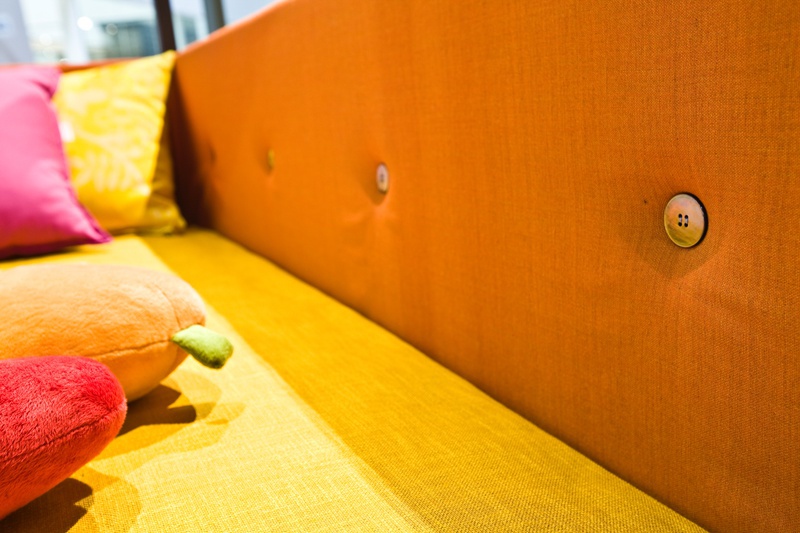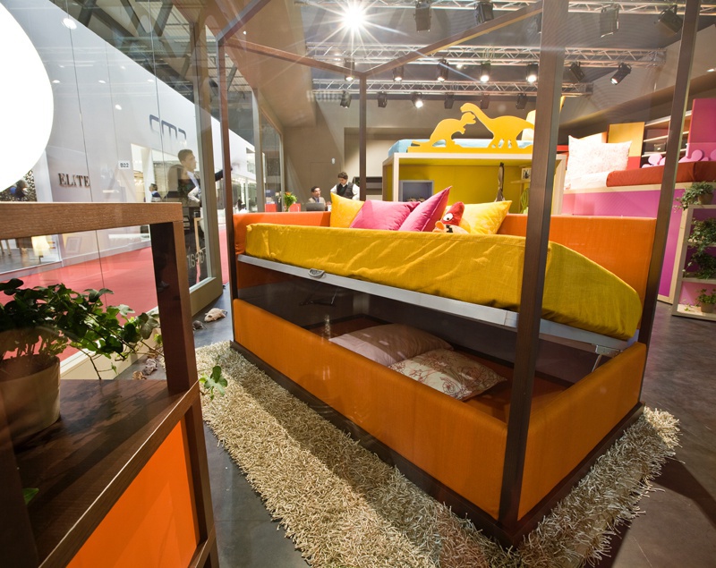 Single bed from Italian manufacturer Dear Kids. The model is made in modern style. The frame is made from solid wood. The finish is offered under the color of natural wood. Backrest and headboard upholstered in textiles. Color option - orange. Complement the design of decorative buttons and pillows. Inside the model is a storage box.