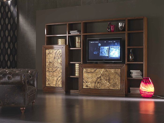 The modular storage system of the Italian manufacturer Cantiero. This wall is designed for the living room. With shelves used to store books and a place for the TV. The original color scheme of natural wood and Golden decorative elements.