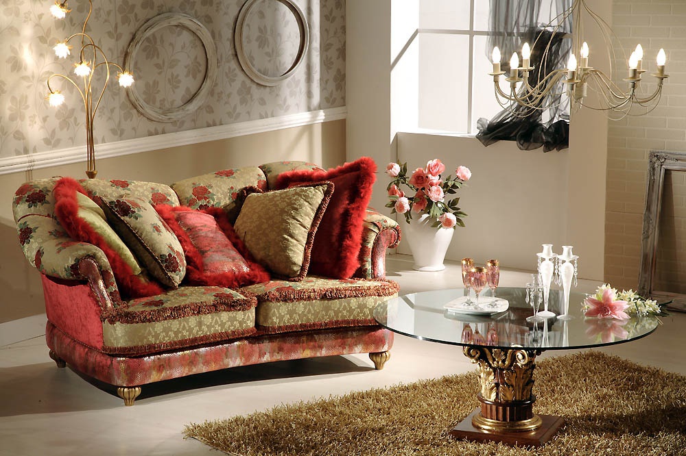 Sofa from Italian manufacturer Guerra Vanni. The frame is made from solid wood, legs - metal, the seat filler - foam, upholstery - textiles from a range of campaigns. Gorgeous model is designed for the living room in the style of glamour. The design of complementary decorative pillows of different sizes. Colours in stock.